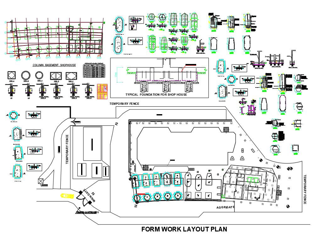 work shop details in a work layout plan, section plan, structure details, foundation for shop house , work shop design draw in autocad format.