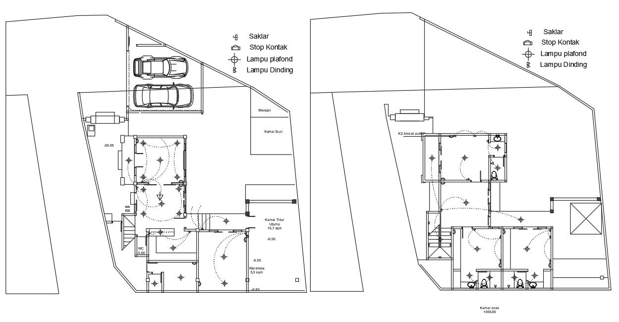 Electrical House layout details in a Switch, Electric socket, ceiling lights, Wall lamp, bedroom, parking are, Electrical House layout design draw in autocad format.