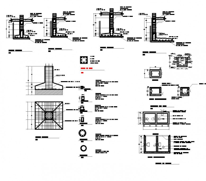 Foundation automobile dealership plan layout file, dimension detail, naming detail, reinforcement detail, bolt nut detail, specification detail, column section detail, tank plan and section detail, main hole detail, etc.