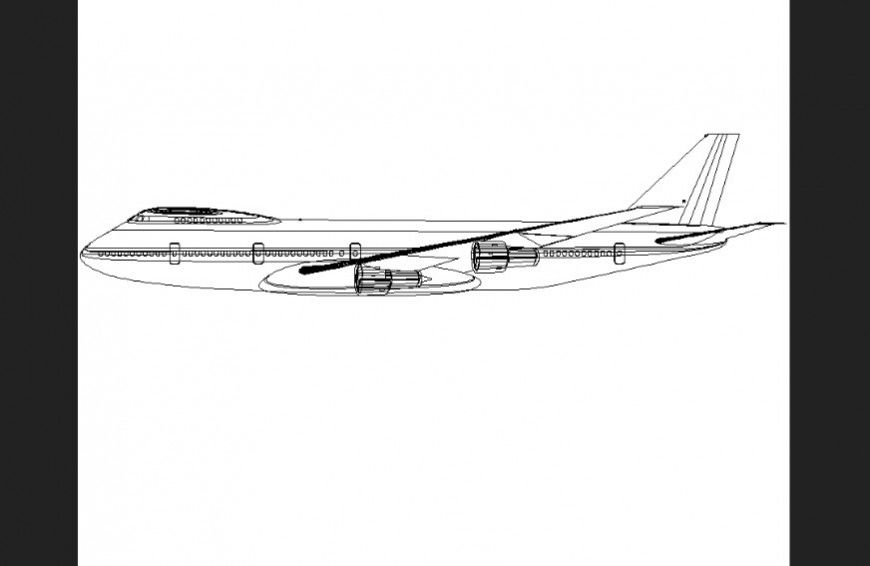 Airplane plan with detail dwg file. The side elevation of a plane with detailing of doors, windows, wheels, metal roads, etc.,