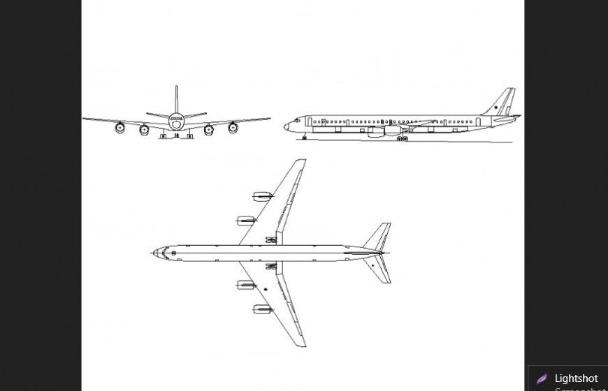 Detailing of plane plan dwg file. The front, side and back elevations of a plane with detailing of doors, windows, wheels, metal roads, etc.,
