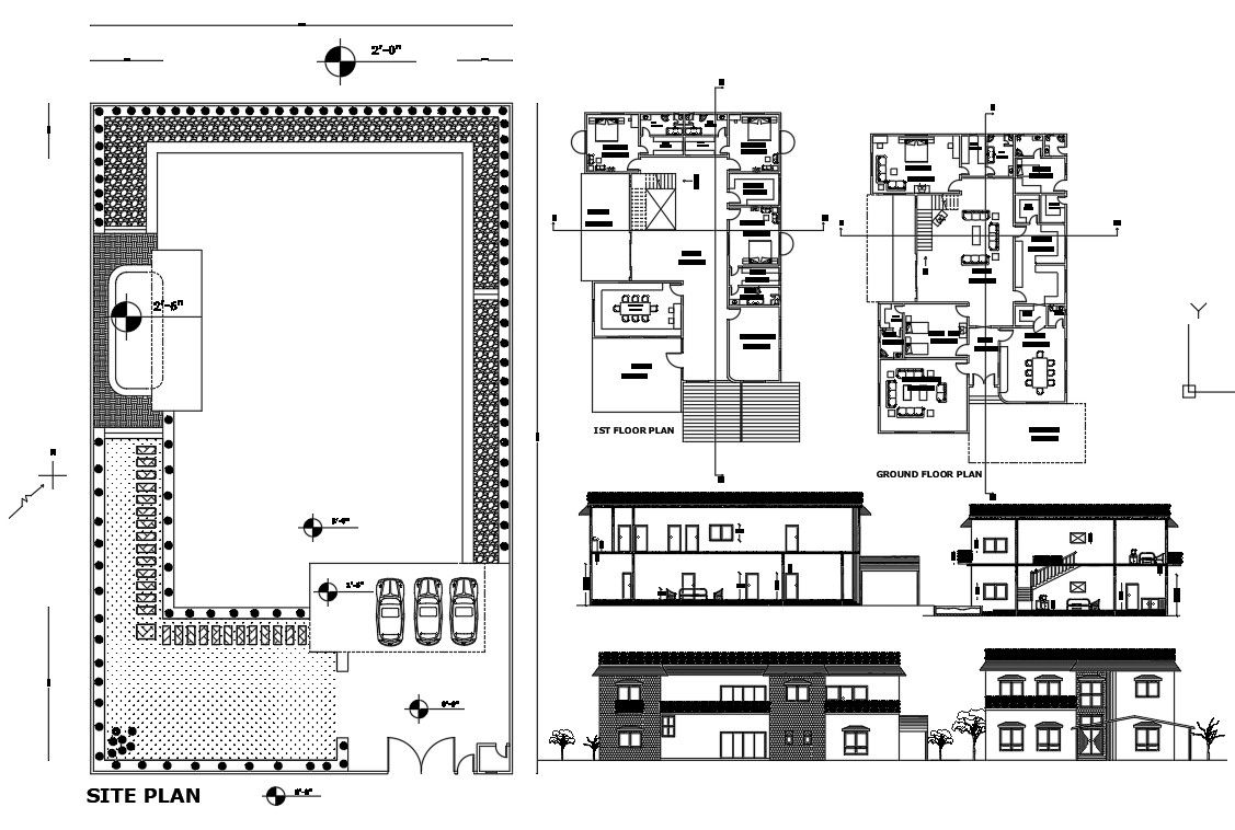 Farm House details in layout plan, elevation design, block details in furniture details, car details, bedroom, kitchen, living room, dining room, Farm House design draw in