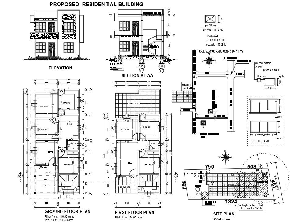 Residential House Details in a layout plan, elevation details, section plan, kitchen, bedroom, living room, dining room, Residential House design draw in autocad format.