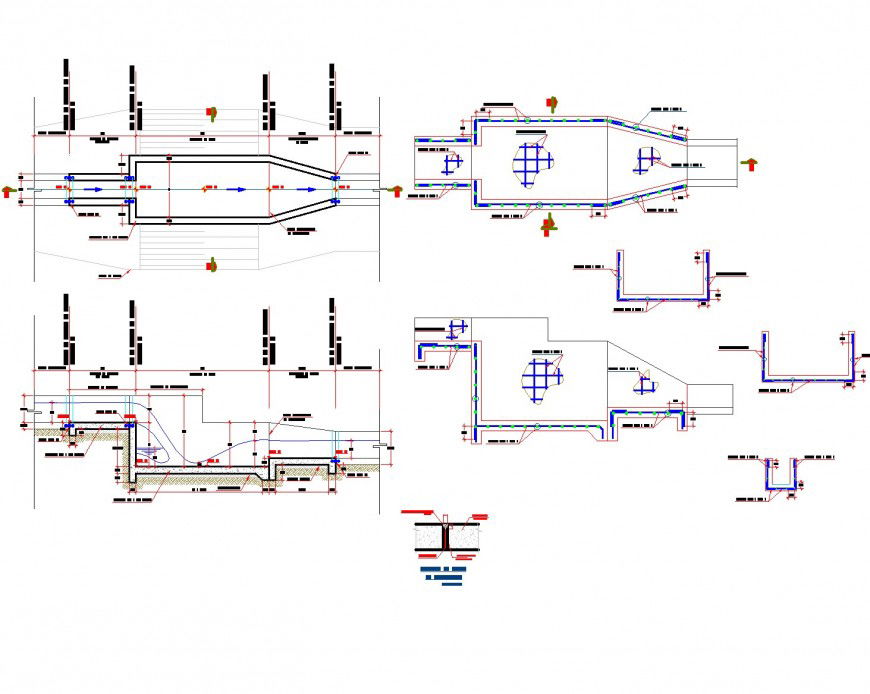 Rapids plan and section autocad file, section line detail, dimension detail, naming detail, reinforcement detail, bolt nut detail, hatching detail, etc.