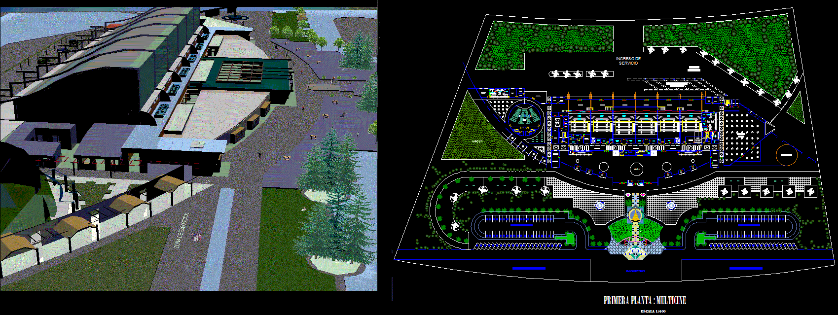 This Multiplex Complex CAD drawing file provides a comprehensive and detailed architectural plan, including the full site layout, parking zones, and an impressive 3D exterior view. The drawing illustrates the multiplex’s structural composition, including main halls, entrance areas, and landscaped surroundings. The design ensures a perfect blend of functionality and aesthetics, ideal for large-scale entertainment or commercial projects. The plan clearly represents circulation flow, entry and exit points, and visitor accessibility, offering a professional reference for architects and engineers.