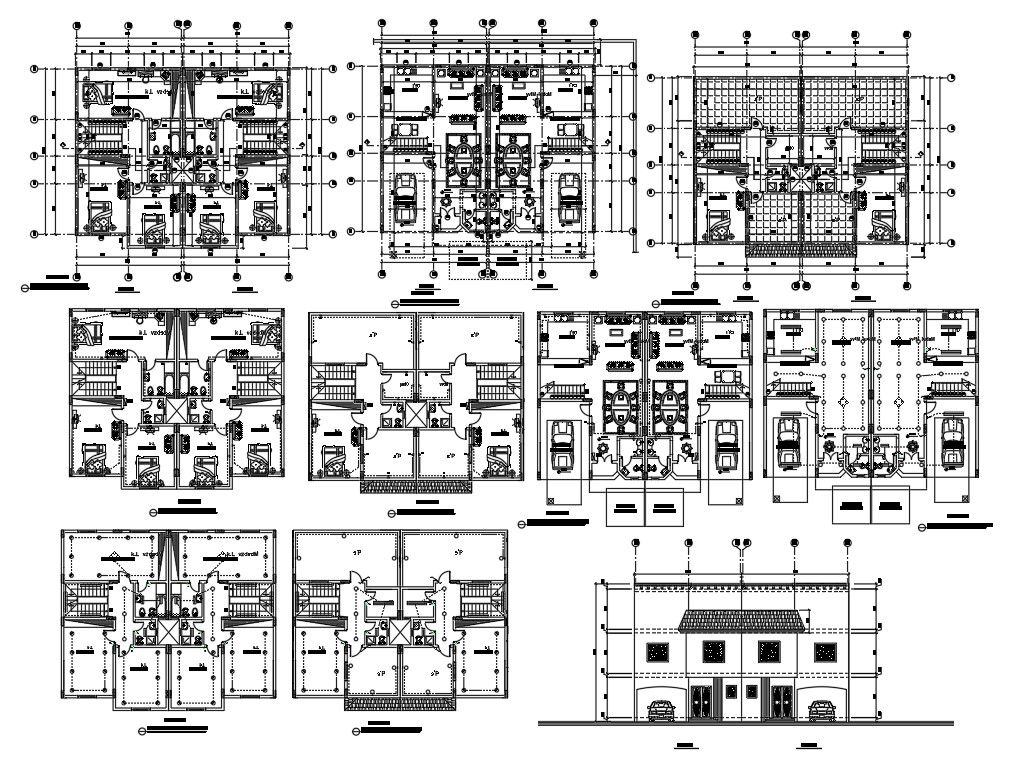 Duplex House details in a layout plan, elevation details, parking area, living room, dining room, bed room, furniture details, Duplex House design draw in autocad format.