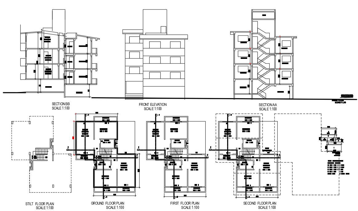 Apartment house details provide in a parking area, kitchen, bedroom, bathroom & toilet, living room, stairway details, Apartment house design draw in autocad format.