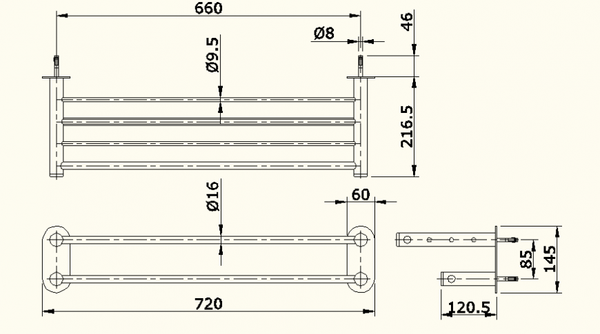 Hanger system detail elevation dwg file, center line detail, dimension detail, side elevation dteail, top view detail, etc.
