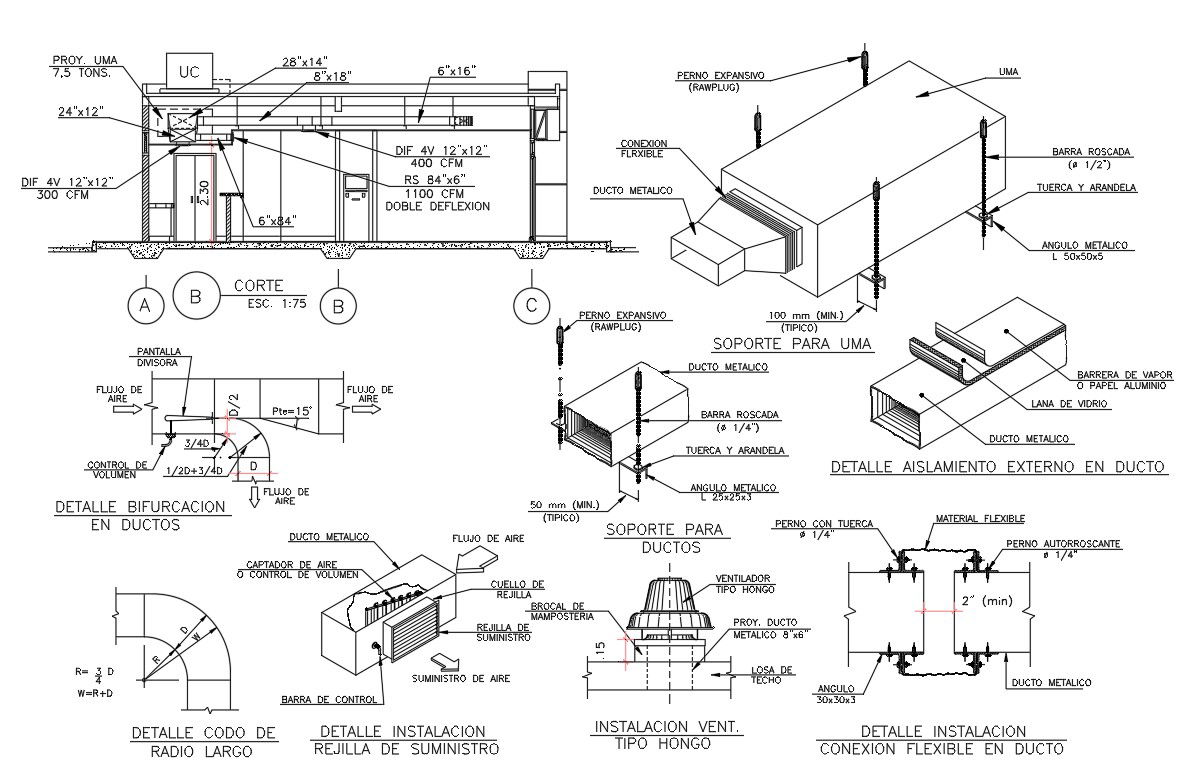 structure details provide supply grille installation details ,fork in pipeline, air flow , details external insulation pipeline,material flexible, structure design draw in autocad
