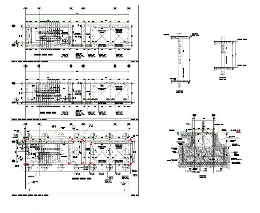 Circulation nucleus plan dwg file, centre line plan detail, dimension detail, naming detail, concrete mortar detail, cut out detail, stair detail, section lien detail, pipe line detail, etc.