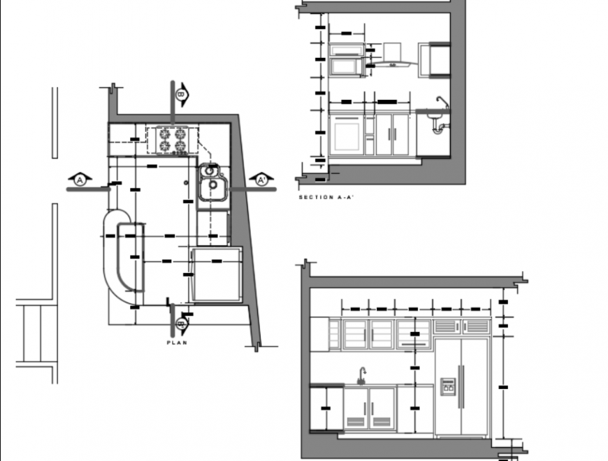 Top view layout plan of kitchen, various layouts are shown, complete furniture detailing of kitchen