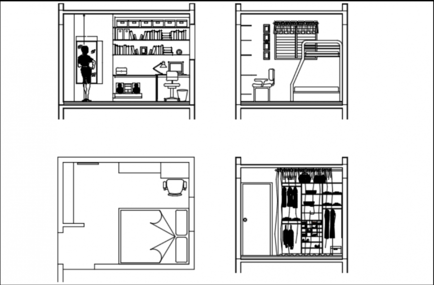 Bedroom interior design ,this file contains top view of a bedroom, bed, book shelves is shown, sectional elevations are show , wardrobe detailing