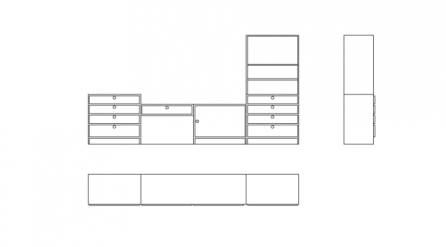 Modular tv unit and book shelf,here there is top view of tv unit with book shelf elevation and tv unit