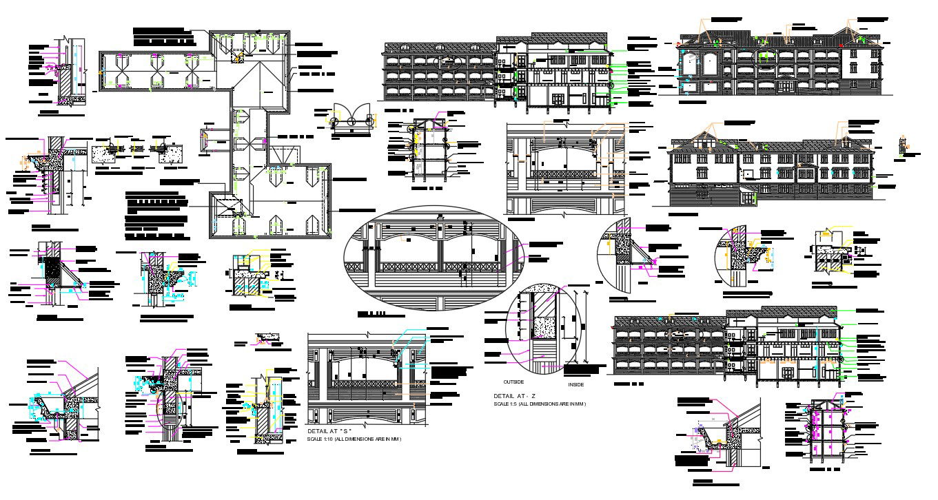 College building details in a elevation plan, layout plan, structure details, class room, library , door & window details ,section plan, wooden details, College building design