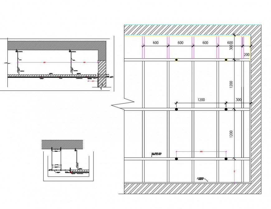 Gypsum ceiling detail dwg file, dimension detail, naming detail, hatching detail, reinforcements detail, bolt nut detail, section line detail, etc.