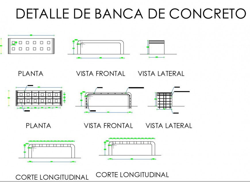 Reinforced concrete bench layout file, dimension detail, naming detail, top view detail, front elevation detail, side elevation detail, section A-A’ detail, section B-B’ detail, etc.