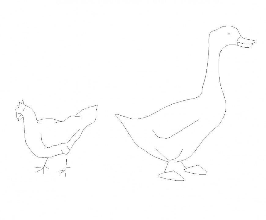 Hen plan layout file, beak detail, two legs detail, two eyes detail, front elevation detail, etc.