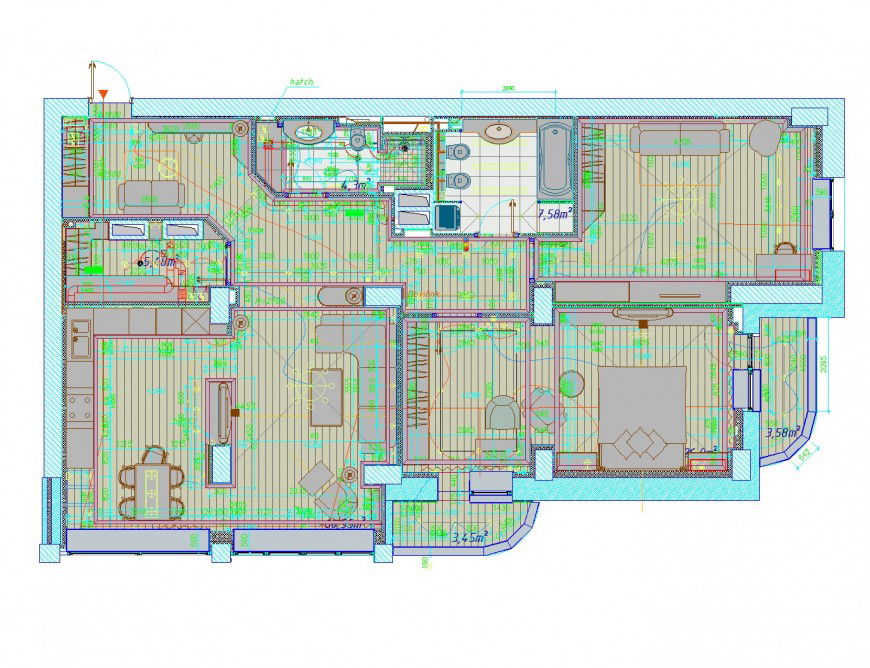 Apartment house plan layout file, dimension detail, naming detail, color detail, furniture detail in table, chair, door, window, sofa and cub board detail, hatching detail, etc.
