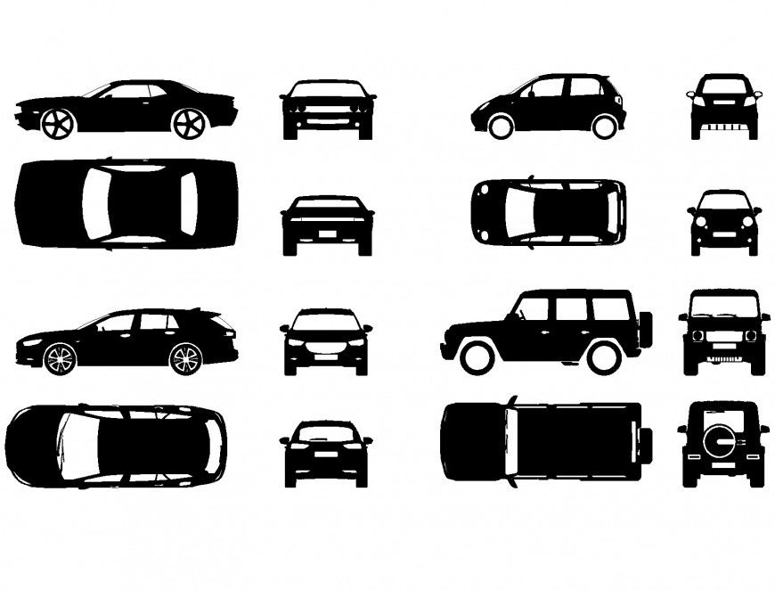 Car icons plan autocad file, front elevation detail, left side elevation detail, right elevation detail, back elevation detail, etc.