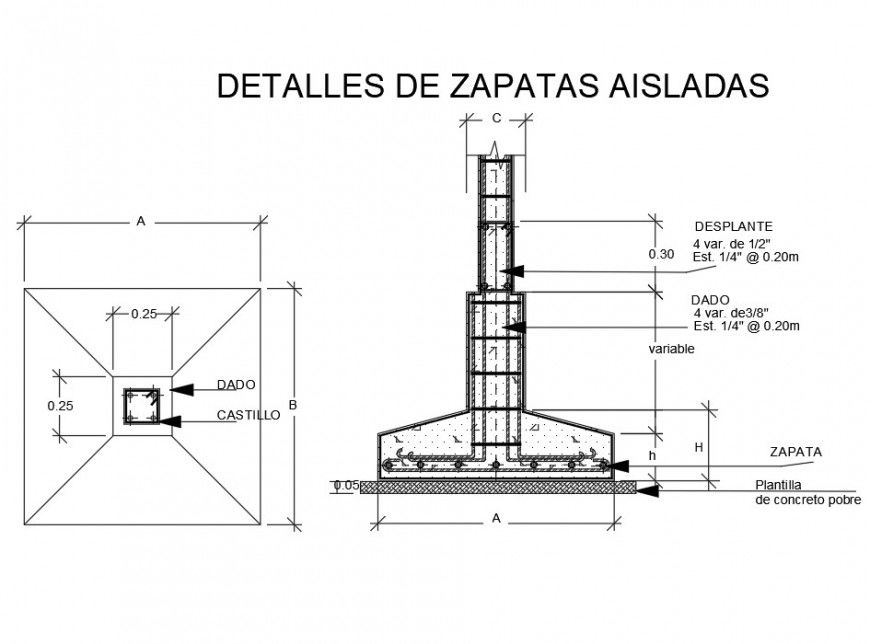 Foundation plan detail elevation layout file, reinforcement detail, isolated footing detail, stirrups detail, cover detail, top view detail, dimension detail, center line detail, cut out detail, hatching detail, naming detail, concreting detail, etc.