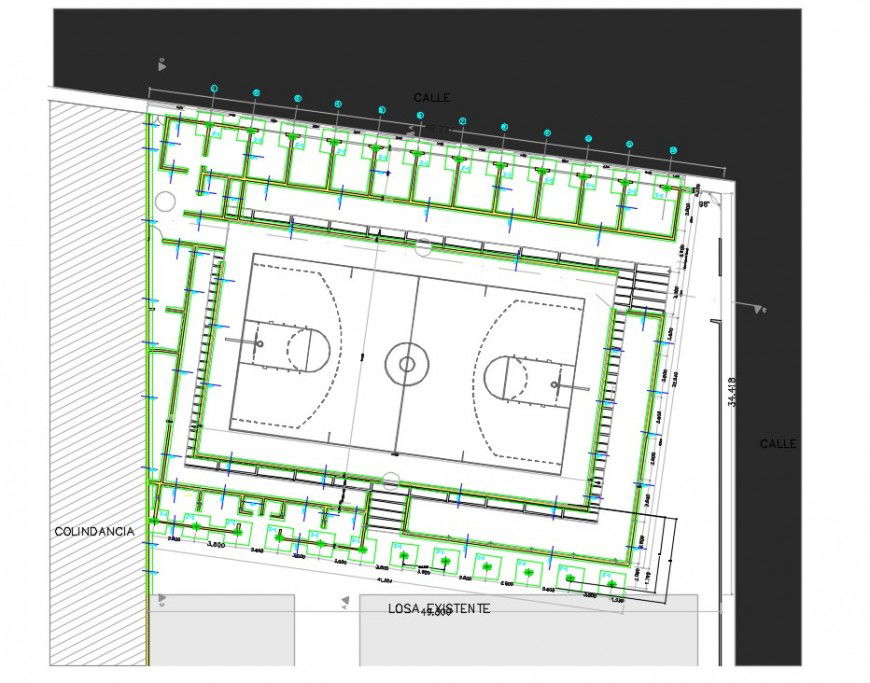 Coliseum foundations autocad file, centre line plan detail, dimension detail, naming detail, hatching detail, game zone detail, section line detail, etc.