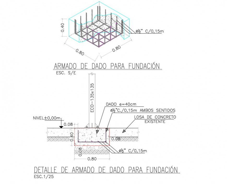 Foundation ceiling detail plan dwg file, foundation section detail, reinforcement detail, concrete mortar detail, hatching detail, bolt nut detail, etc.