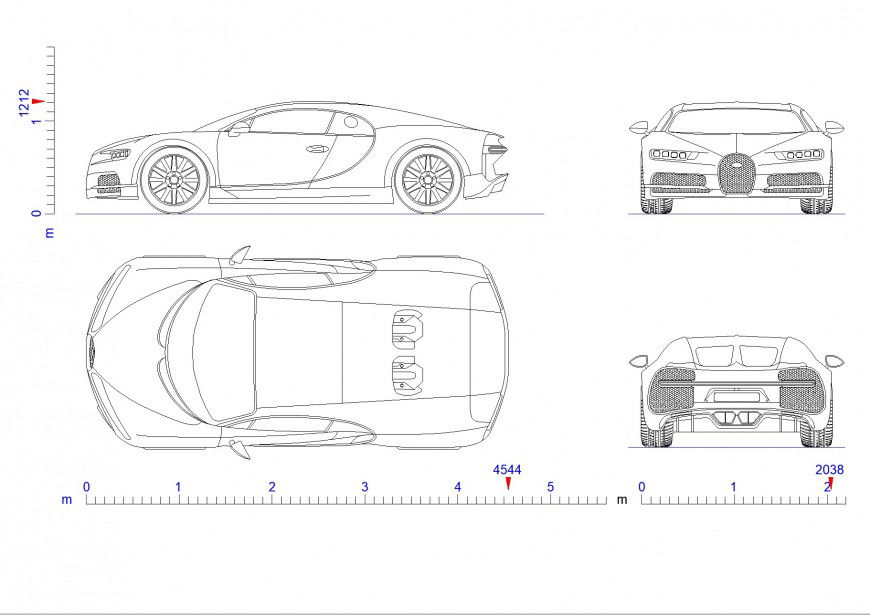 Bugatti Chiron car plan autocad file, dimension detail, naming detail, front elevation detail, left elevation detail, right elevation detail, back elevation detail, etc.
