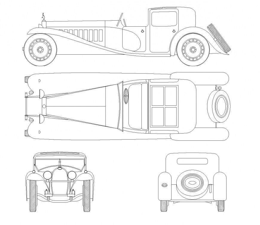 Bugatti royale plan layout file, front elevation detail, left elevation detail, right elevation detail, back elevation detail, etc.