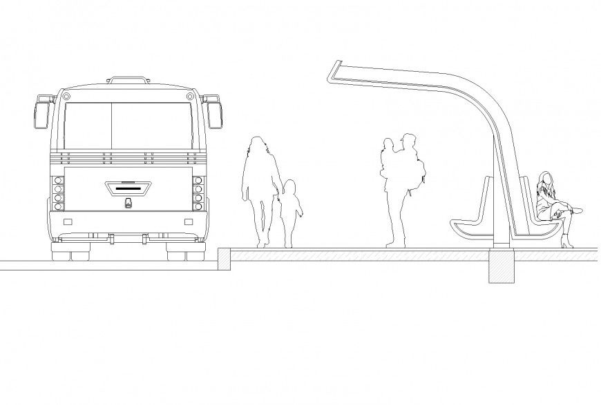 Bus stop plan layout detail, street light detail, mirror detail, front elevation detail, etc.