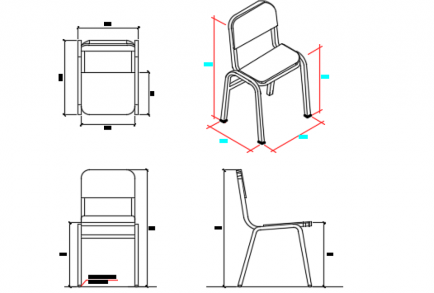 School chair design,side view and front elevation details of single seating chair, measurements details are shown