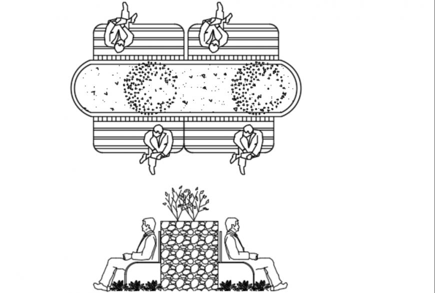 Park seating area view, here there is front and top view detailing of park, garden area details in 2d