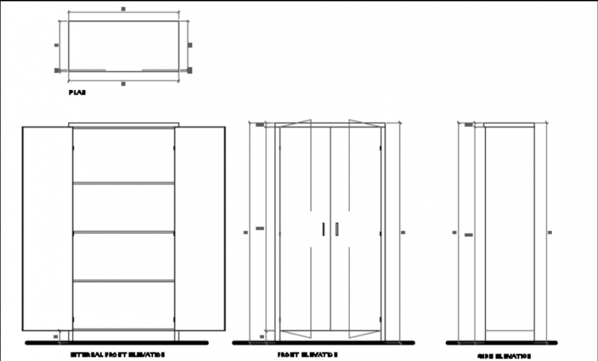 Storage cabinet front view,side view and front elevation details of a wardrobe , its plan and front view is shown