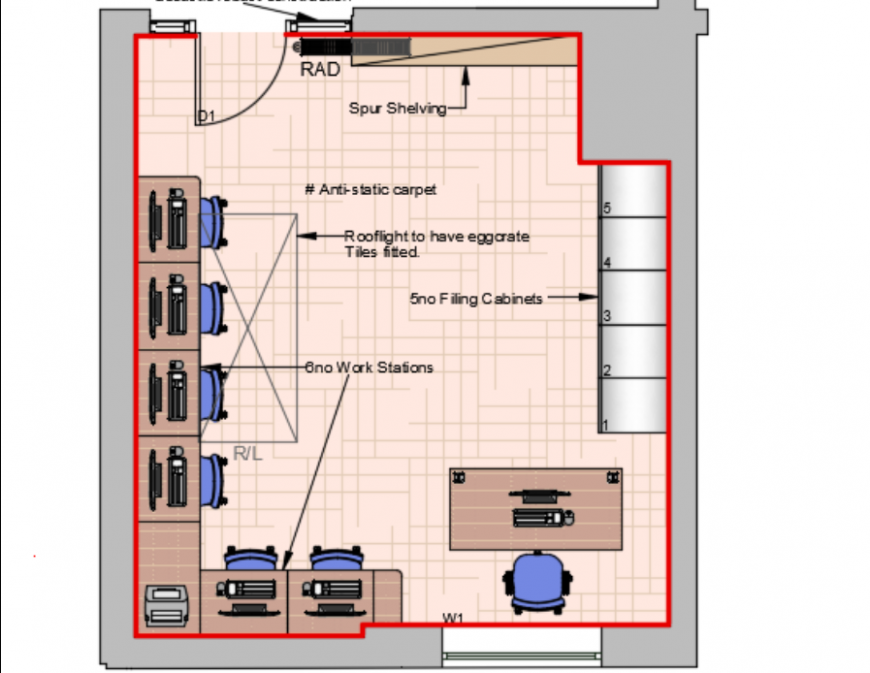 IT room top view plan, layout plan of a room, each and every detail required is shown in this file , different departments , area etc