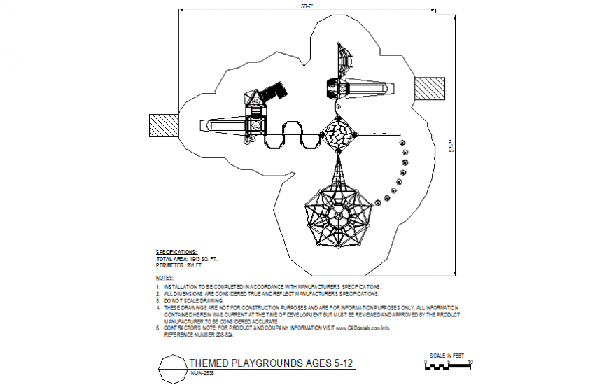 Themed playground plan design dwg file in plan with view of themed playground with view of area and view of hexagonal pannel with circular transfer system and design with view of spiral frame with zip slices in plan of playground.