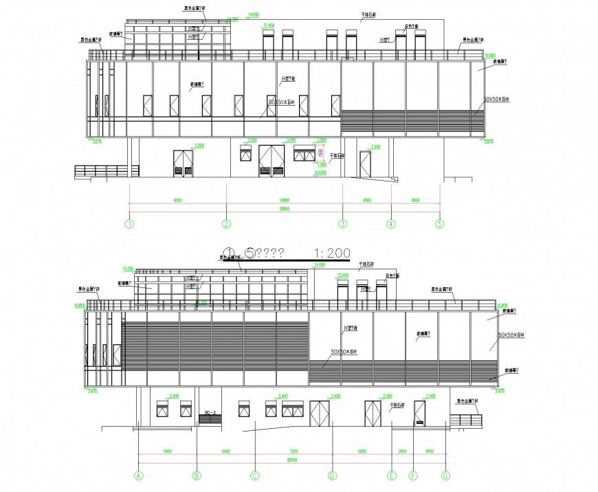 Class room elevation plan dwg file, dimension detail, naming detail, furniture detail in door and window detail, centre line plan detail, scale 1:200 detail, hatching detail, etc.
