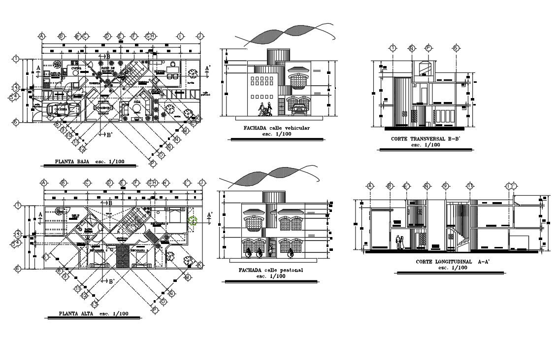 Modern House Elevation In DWG File which shows the parking, hall, kitchen, dining room, study room, office, bedrooms, terrace plan, It also includes elevations of the house.