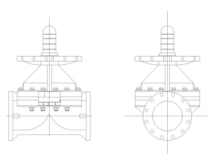 Diaphragm valve plan dwg file, front elevation detail, centre lien plan detail, etc.