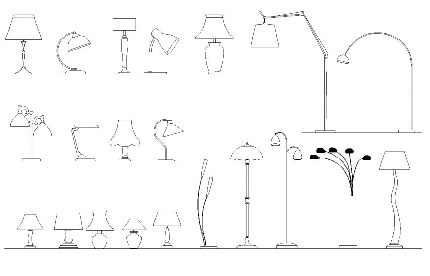 Light lamps design elevation autocad file, table lamp detail, T-shape light lamp detail, round shape lamp detail, light pole lamp detail, etc.
