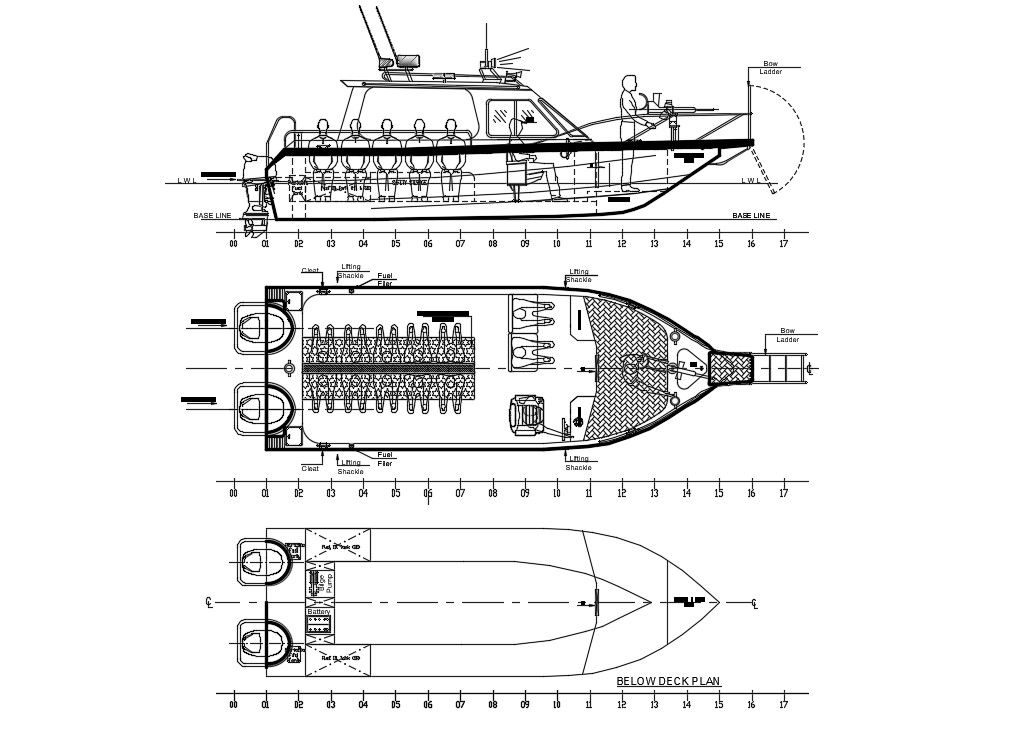 Boat Layout In DWG File which shows sitting, storage, anchor and rope store, baseline, bow ladder, fuel filler, lifting shackle and below deck plan.