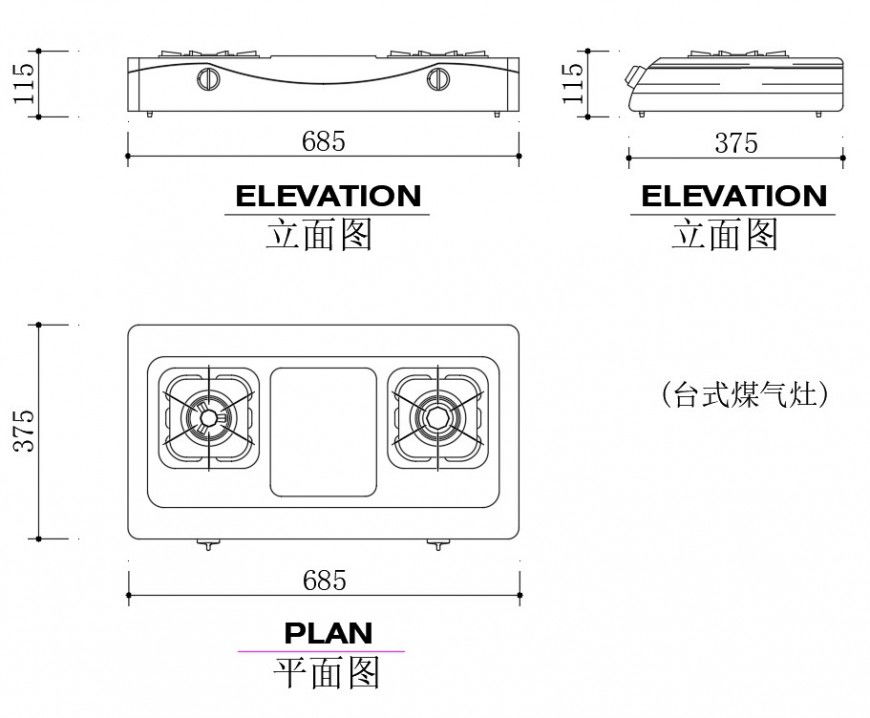 Benchtop gas stove CAD detail, plan detail, front elevation detail, side elevation detail, dimension detail, naming detail, etc.