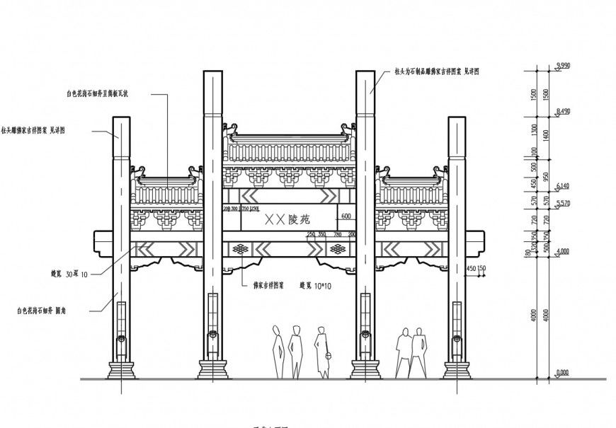 Church font elevation dwg file, naming detail, dimension detail, column design detail, arc design detail, etc.