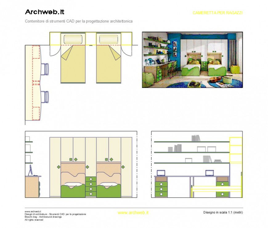 Children bed room plan autocad file, furniture detail in bed, cub board detail, library books detail, scale 1:100 detail, etc.