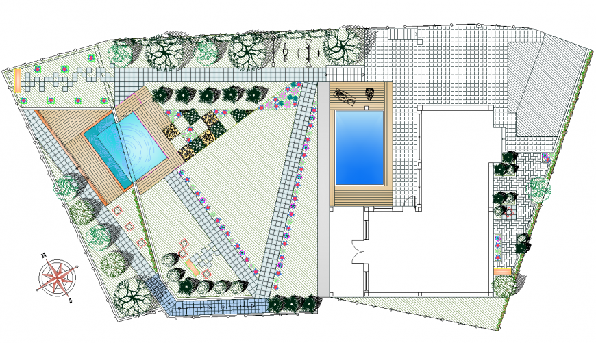 Landscaping bungalow detail elevation layout file, garden detail, door and window detail, pool detail, hatching detail, direction detail, landscaping trees and plants detail, etc.