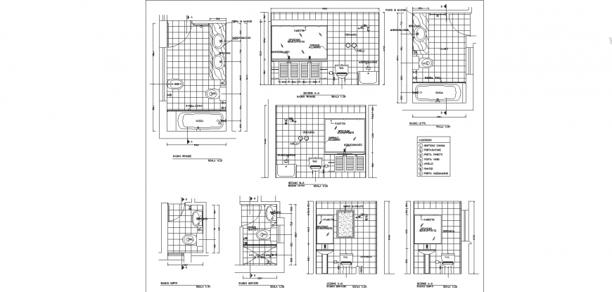 Bathroom plan detail dwg file. The top view plan with detailing of wash basin, bathtub, commode, flooring, etc., The elevation of a bathroom with detailing of wash basin, mirror, wall tiles, dimensional detailing, etc.,