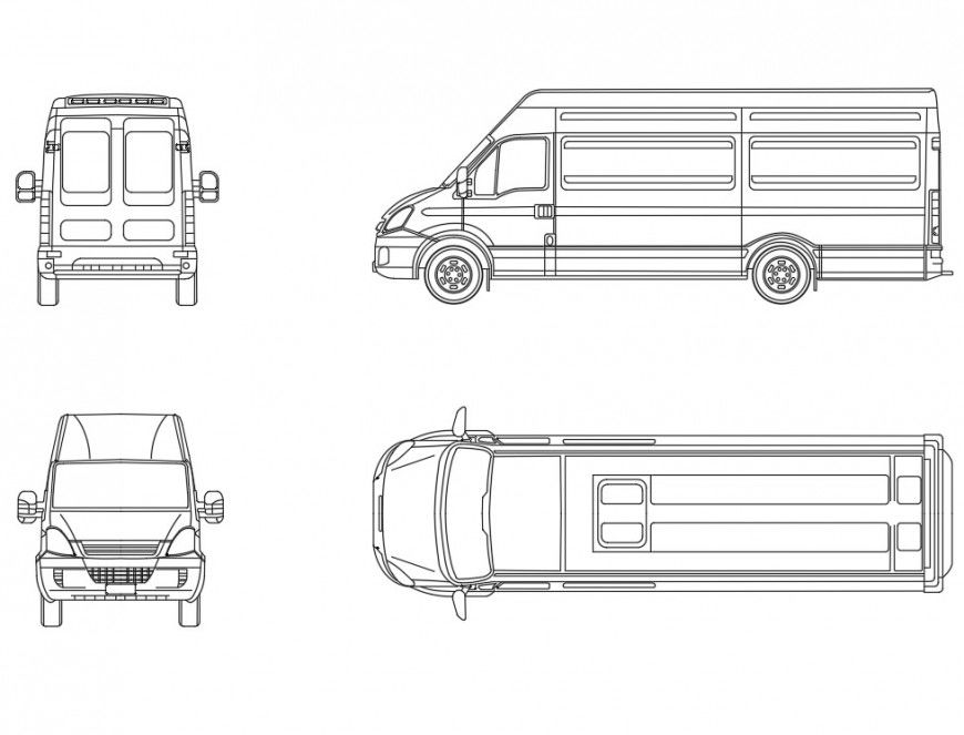 Iveco daily elevation view, front elevation view detail, right elevation view detail, side elevation view detail, back elevation view detail, wheel detail, mirror detail, etc.
