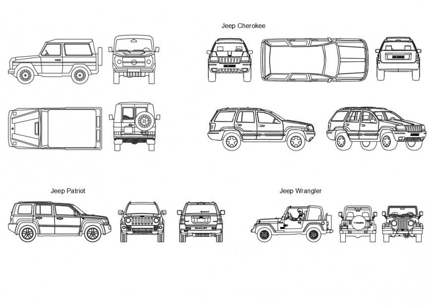 Jeep elevation plan, front elevation view detail, side elevation view detail, back elevation view detail, etc.