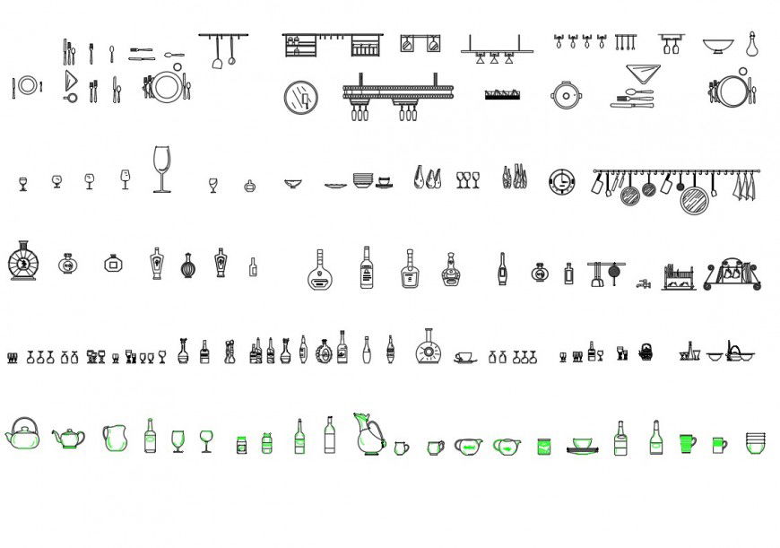 Kitchen dishware plan, glass bottle detail, cup and saucer detail, dish and bowl detail, spoon and stand detail, etc.