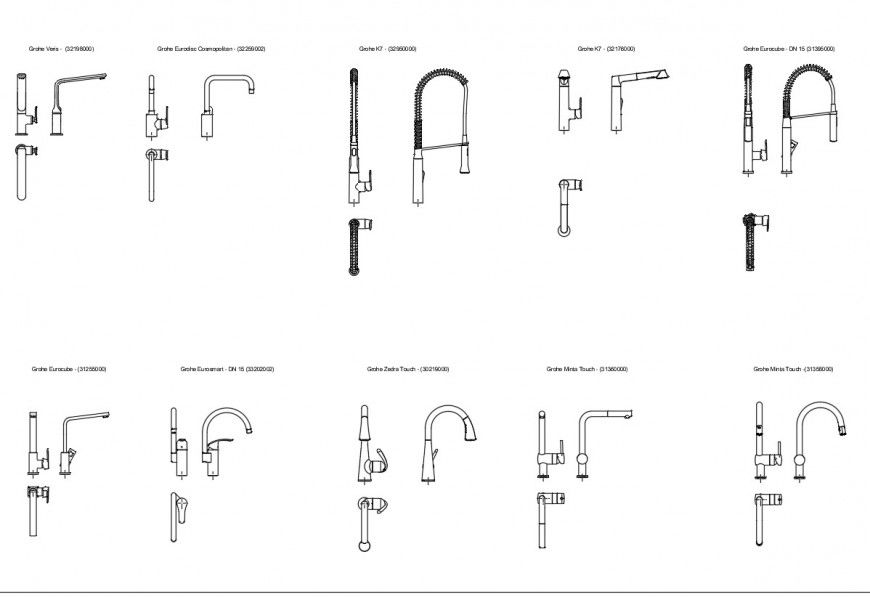 Kitchen faucets plan, arc shape trap detail, top view detail, side elevation detail, front elevation detail, etc.