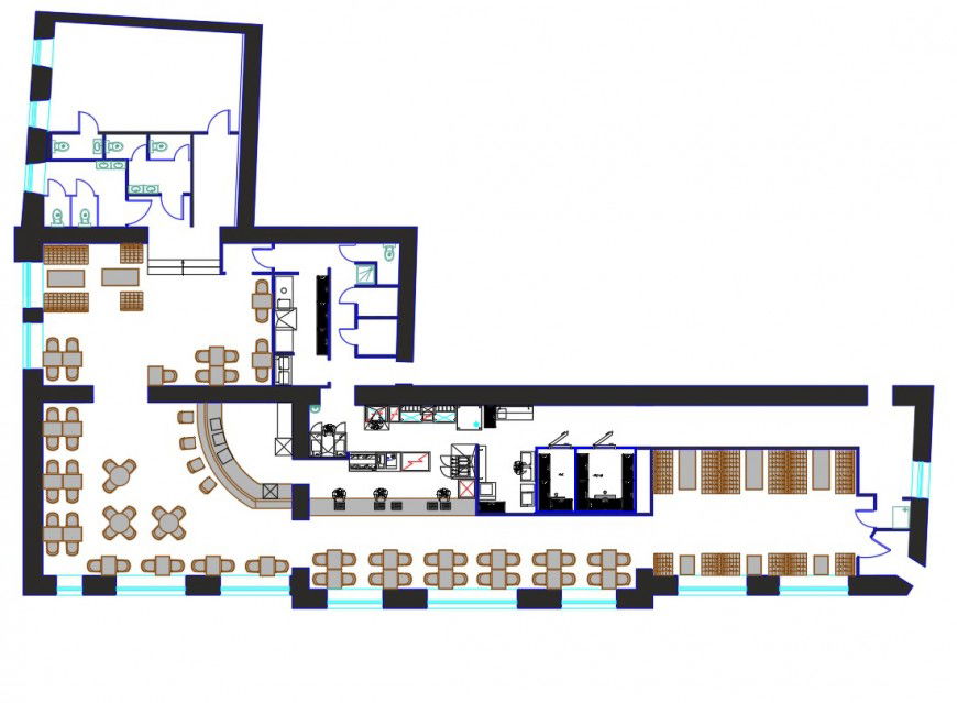 Kitchen of the restaurant plan, furniture detail in door, table, chair and window detail, cut out detail, toilet detail, etc.