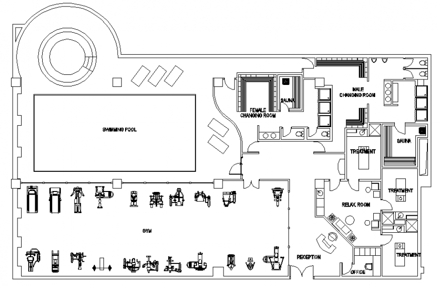 Gym plan detail elevation layout file, plan view detail, furniture detail, equipment detail, door and window detail, reception office detail, changing room detail, etc.
